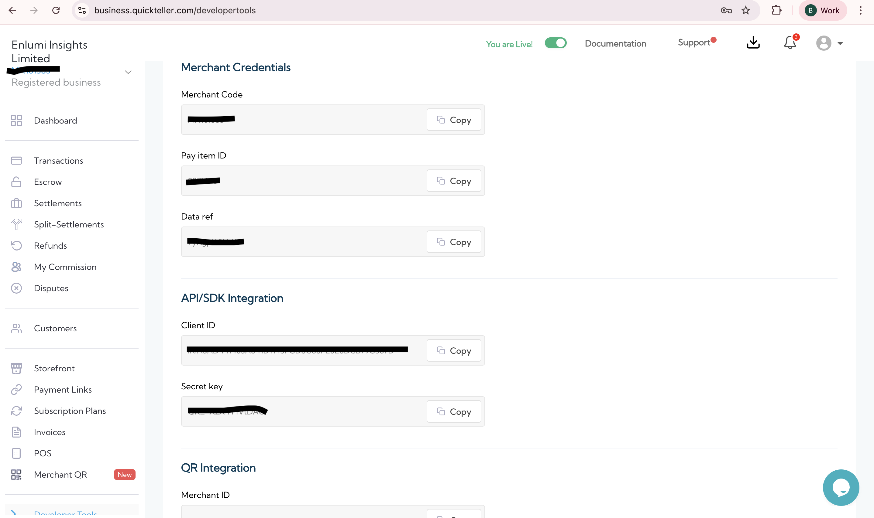 Lumi communicates with Interswitch through Quickteller’s secure API gateway. For this to work, you must retrieve your developer credentials from the Quickteller dashboard. To access them: