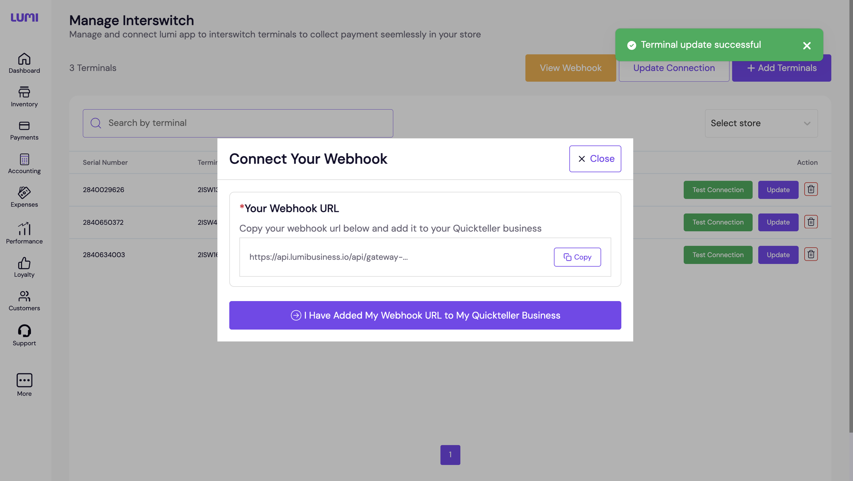 This one-time setup completes the secure handshake between Lumi and Quickteller. At this point, your Lumi account is officially authorised to communicate with Interswitch, allowing it to initiate payment requests and receive real-time payment confirmations from your terminal.