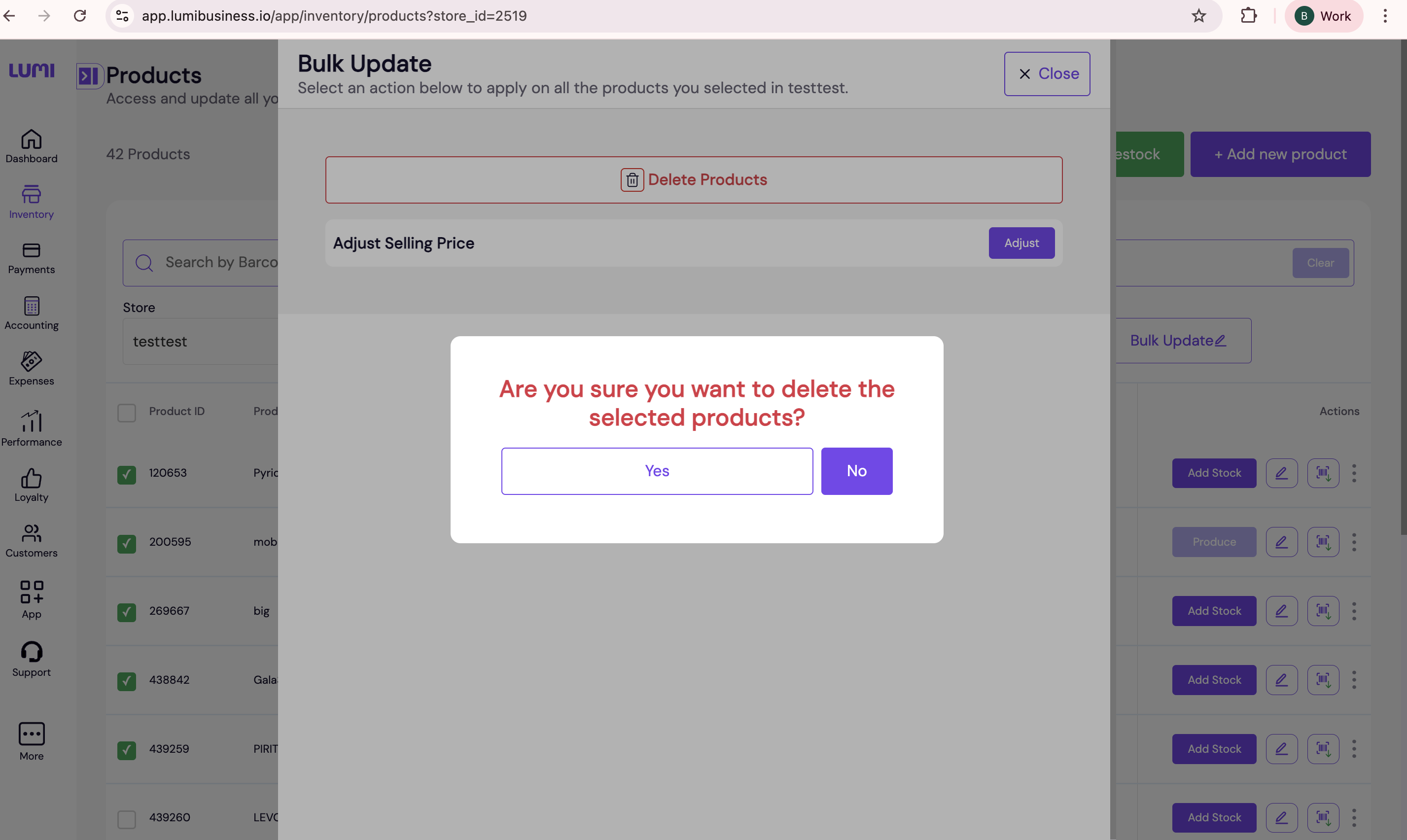 Clicking Bulk Delete triggers a modal confirmation prompt: