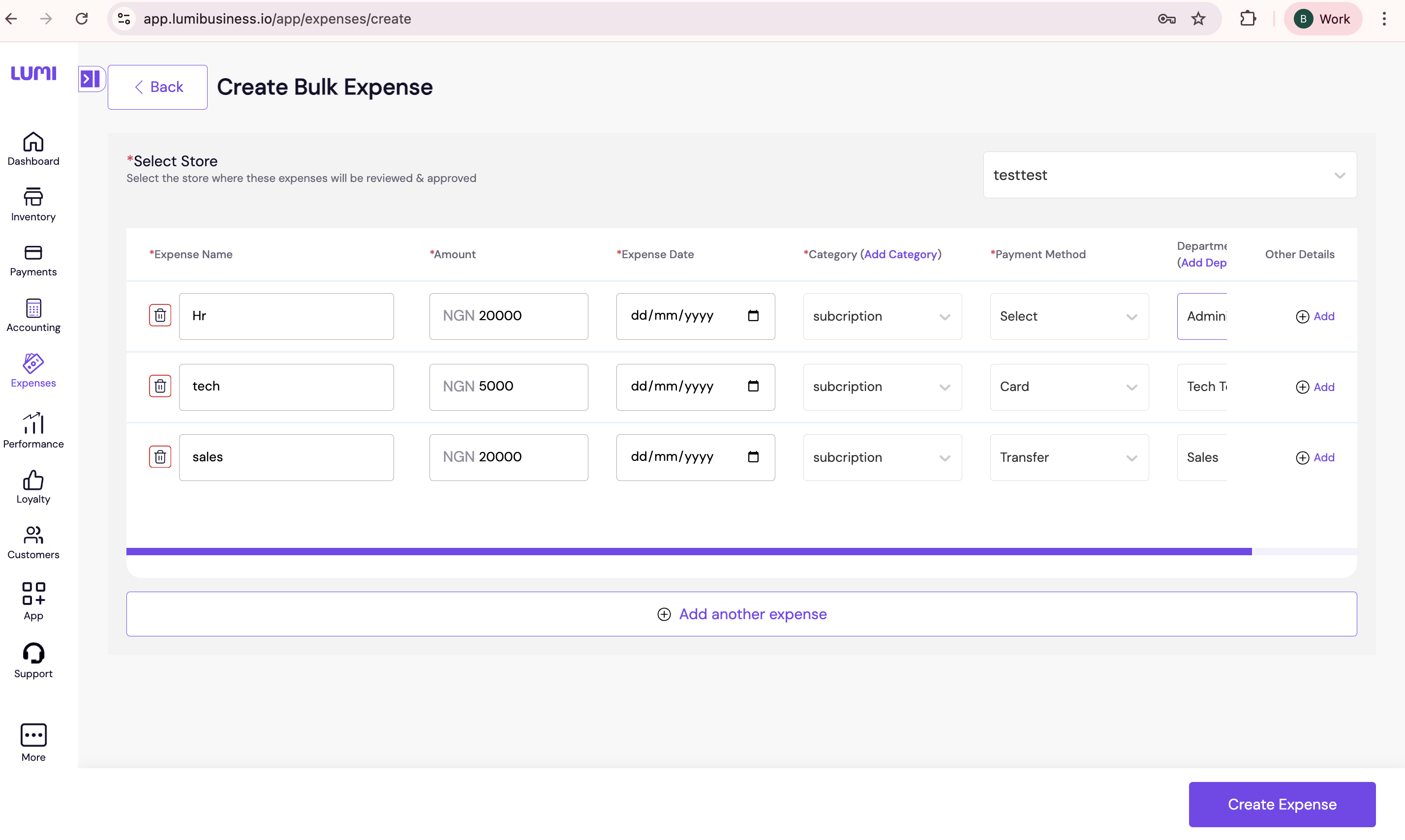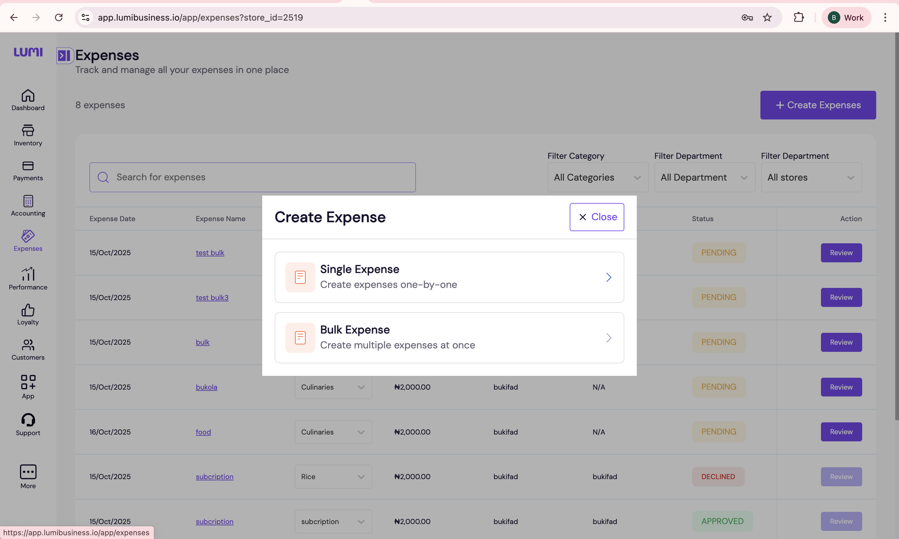 Bulk expenses are store-specific, meaning each submission must be made under a chosen store. This ensures clean financial separation across locations and improves reporting accuracy.
