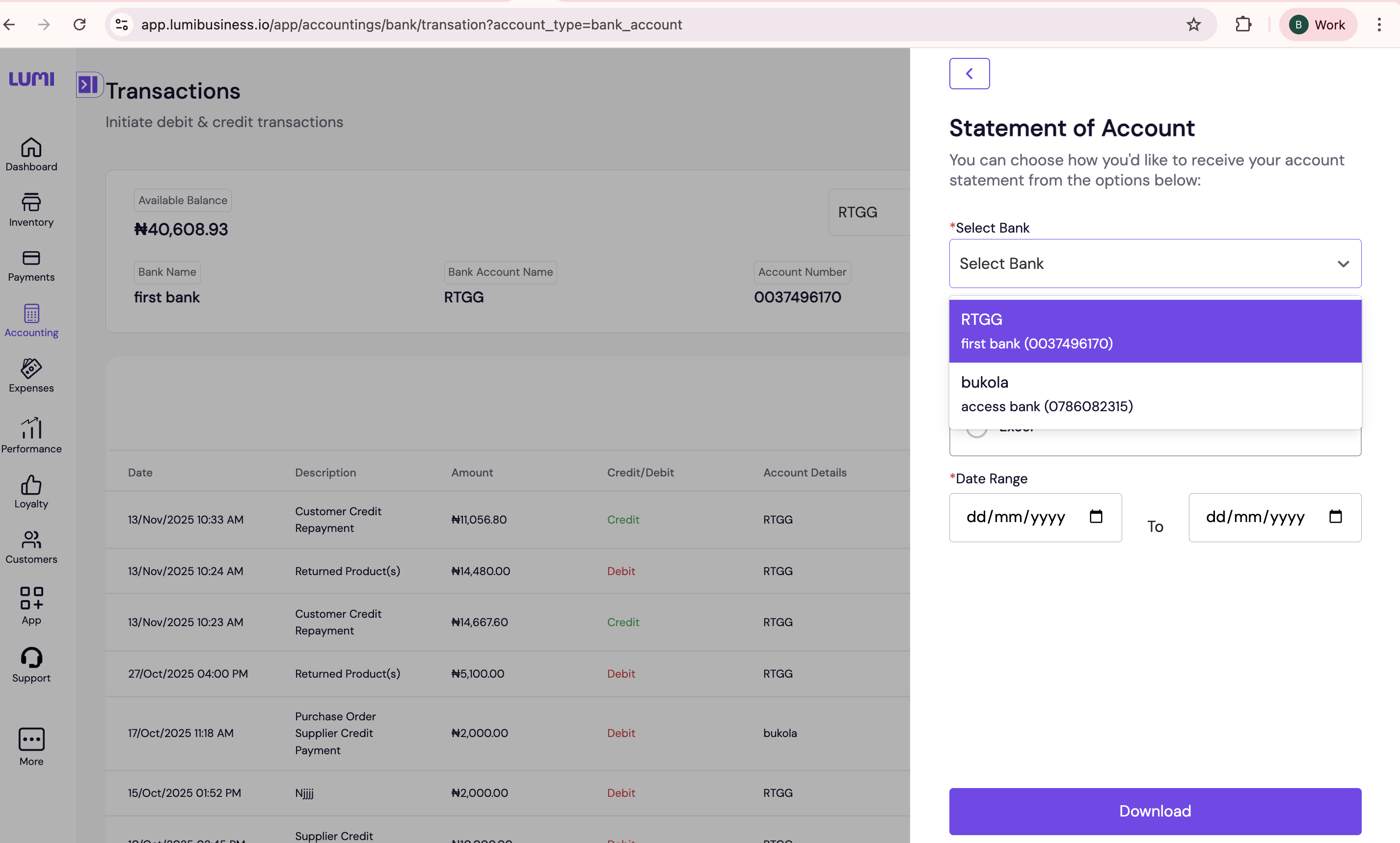 The proposed functionality enables users to generate a downloadable Statement of Account directly from the Accounting Module. This document would summarize historical transactions for the selected account type over a specified period.